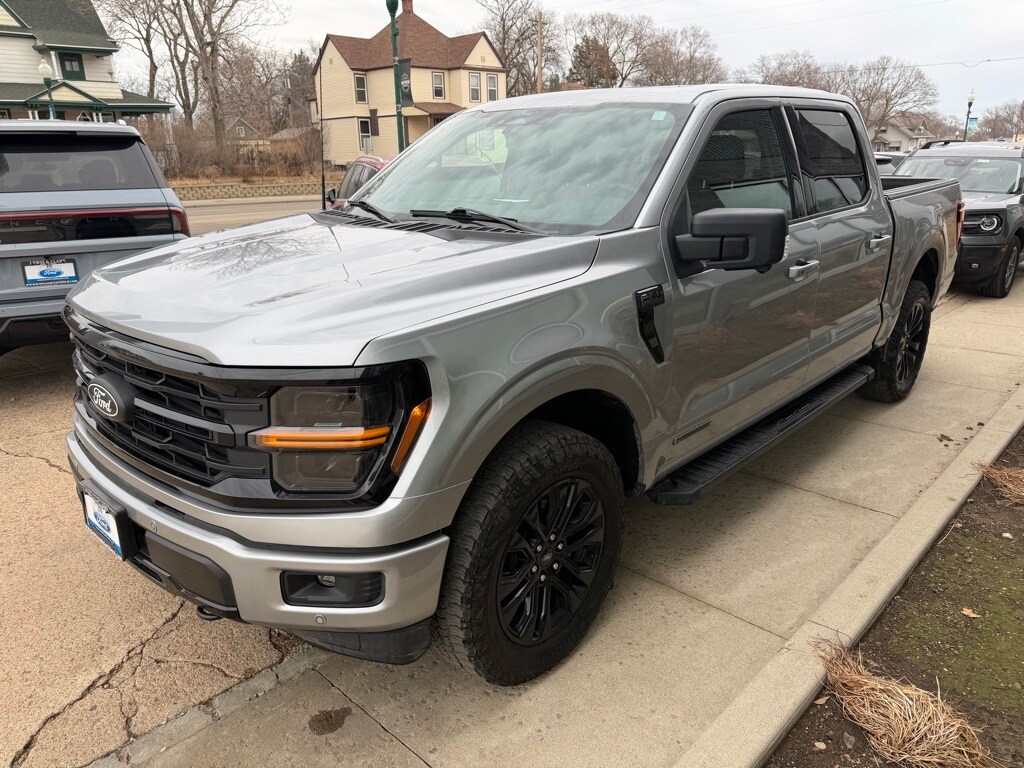 Silver Metallic 2025 Ford F-150 XLT 4WD 10-Speed Automatic 3.5L PowerBoost Full-Hybrid V6 ONE OWNER, 3.5L PowerBoost Full-Hybrid V6, 4WD, 360 Degree Camera, 4-Wheel Disc Brakes, 400W Cab & Bed Outlets, 6" Angular Bright Anodized Step Bar, 6" Black Running Boards, ABS brakes, Adaptive Cruise Control w/Stop & Go, Air Conditioning, Auto High-beam Headlights, Auto-Dimming Rear-View Mirror, Black Exterior Badging, Black Grille, Black Painted Grille w/Chrome Center Bar, BlueCruise (Equipment + 1-Year Plan), Body-Color Front & Rear Bumpers, Brake assist, Chrome Door & Tailgate Handles, Chrome Single-Tip Exhaust, Connected Navigation, Console Worksurface, Dark Interior Appliques, Delay-off headlights, Driver State Detection, Dual Exhaust w/Black Tips, Dual front impact airbags, Dual front side impact airbags, Dual-Zone Electronic Automatic Temperature Control, Electronic Stability Control, Emergency communication system: SYNC 4 911 Assist, Equipment Group 303A High, Evasive Steering Assist, Floor Shifter, Ford Co-Pilot360 Assist 2.0, Front anti-roll bar, Front fog lights, Front Parking Sensors, Front reading lights, Front wheel independent suspension, Fully automatic headlights, Gray Box Side Decal, Heated Front Seats, Illuminated entry, Integrated Trailer Brake Controller, Intelligent Access w/Push Button Start, Internet access capable: FordPass Connect 5G, Low tire pressure warning, Max Tow Electronic Locking w/3.73 Axle Ratio, Mobile Office Package, Occupant sensing airbag, Outside temperature display, Overhead airbag, Overhead console, Panic alarm, Partitioned Lockable Rear Storage, Passenger door bin, Passenger vanity mirror, Power Glass Heated Sideview Mirrors, Power steering, Power windows, Power-Adjustable Pedals, Power-Sliding Rear Window, Radio: B&O Sound System by Bang & Olufsen, Rear Parking Sensors, Rear reading lights, Rear window defroster, Remote keyless entry, Remote Start System w/Remote Tailgate Release, Security system, Speed control, Split folding rear seat, Steering wheel mounted audio controls, SYNC 4 w/Enhanced Voice Recognition, Tachometer, Telescoping steering wheel, Tilt steering wheel, Tough Bed Spray-In Bedliner, Tow/Haul Package, Towing Technology, Trip computer, Twin Panel Moonroof, Variably intermittent wipers, Voltmeter, Wireless Charging, Wrapped Steering Wheel, XLT Black Appearance Package Plus.